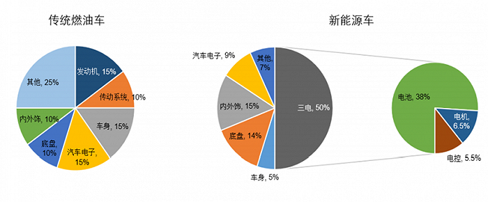 根據(jù)高工機器人數(shù)據(jù),在燃油車成本構(gòu)成中,發(fā)動機、車身與汽車電子占比最高,均為15%,底盤、傳動系統(tǒng)分別占比10%;而在電動車中,“三電”系統(tǒng)占比高達50%,其中電池占比最高,為38%,電機占比6.5%,電控占比5.5%。