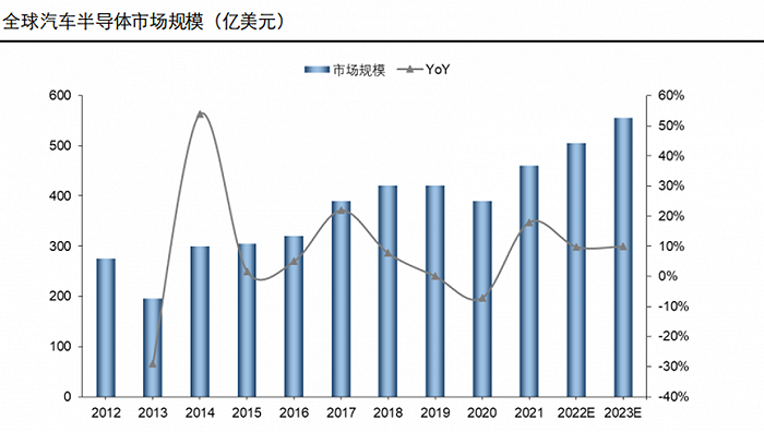 根據(jù)Gartner 和Statista數(shù)據(jù),2012年以來,全球汽車半導(dǎo)體規(guī)模整體呈上升趨勢,2020年受疫情影響僅有390億美元,受益新能源車滲透率提升,預(yù)計到 2023年,全球汽車半導(dǎo)體市場規(guī)模將達到555億美元。