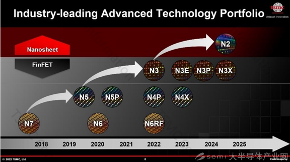 在臺積電2022年技術(shù)論壇上,臺積電公布了7nm至2nm先進制程,以及包括射頻/連網(wǎng)性、CMOS影像感測、MEMS和電源管理在內(nèi)的特色工藝的現(xiàn)狀與規(guī)劃等。其中,2nm工藝將在2025年量產(chǎn)。